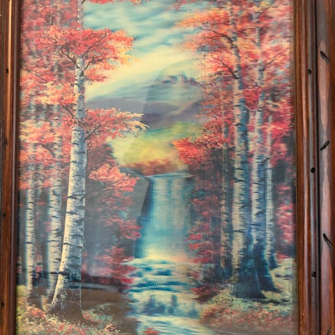 Dette er et oljemaleri av et fjellområde med en foss og vegetasjon. Maleriet kunne hatt tittelen «Ser du Tiuren?»