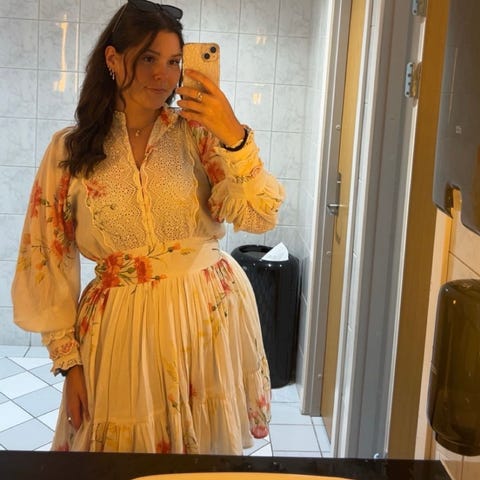 Nydelig håndlaget festdrakt / eventyrdrakt. Kjøpt på Finn. Har selv fått den sydd inn etter den ble kjøpt for å få den kortere i ryggen, da den var sydd til mannekeng dukke og var for lang. Jeg er 157.