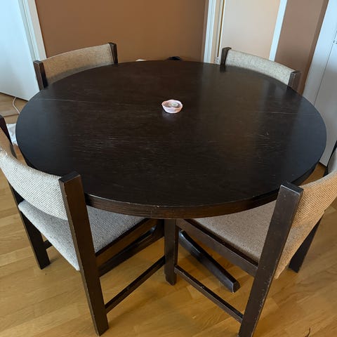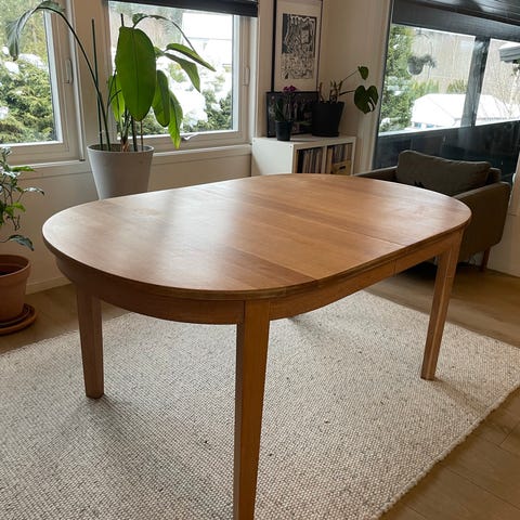 Kjempefint bord i heltre eik. Liten sprekk på midten men ser det så vidt. Slipt og nylakkert. Ny pris nesten 20K. Får ikke demontert det, så må fraktes helt. Høyde 75 cm. Hentes i Asker.