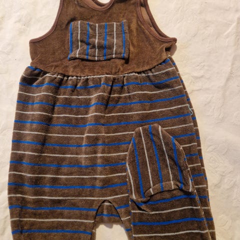 Denne utrolig kule sparkebuksen fra 70-tallet har aldri vært brukt. Knall oransje. Står ikke størrelse i den, men måler ca 60 cm fra skulder til fot. Den er nok smalere i fasongen enn de som lages i dag. Få den kuleste retro-babyen i gata :)