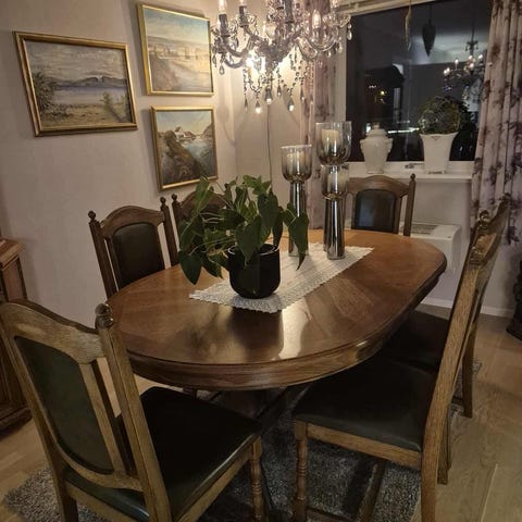 Hvitmalt kjøkken spisebord, 4 stoler n/puter og hjørneskap.