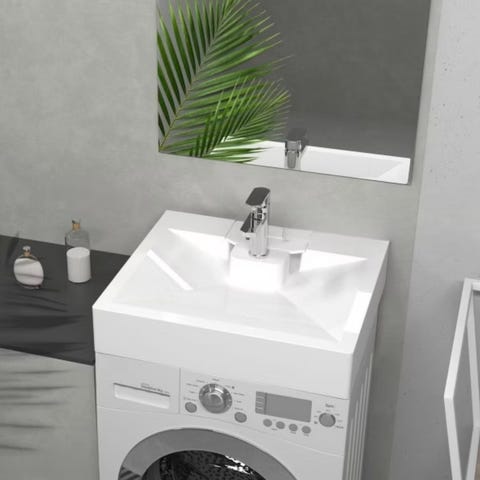 Speilskapet har speilfronter og overlys med flere innfelte spotter. Innredningen passer til vanlig baderomsbruk med kombinert oppbevaring og vaskeløsning i kompakt format. Hvit, nøytral design som kan tilpasses ulike baderomsstiler.