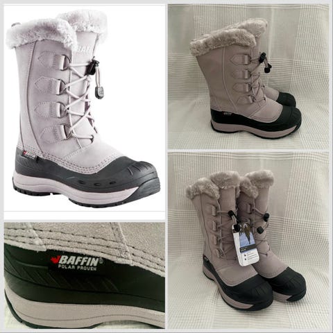 Baffin vinterstøvler i størrelse 38. Støvlene er høye med snøring foran og har kraftig yttersåle i gummi med mønster tilpasset vinterføre. Overdelen er i beige materiale med sort gummikalosj i front og lys, myk fôrkant øverst. Egnet som varme og robuste vinterstøvler til bruk i kaldt vær. Temperaturgrense - 40 grader. 7 lags uttagbar innerstøvel.
