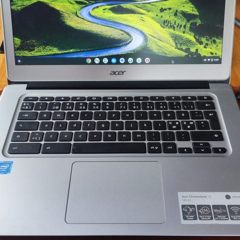 Acer Chromebook 514 bærbar PC med 14-tommers skjerm i sølvfarge. Modellen kjører ChromeOS og har Intel-prosessor. Tastaturoppsettet er nordisk. Kabinettet er i metallfinish. Egnet til bruk av både voksne og barn til nettlesing, skolearbeid og enkle kontoroppgaver i nettleserbaserte programmer.