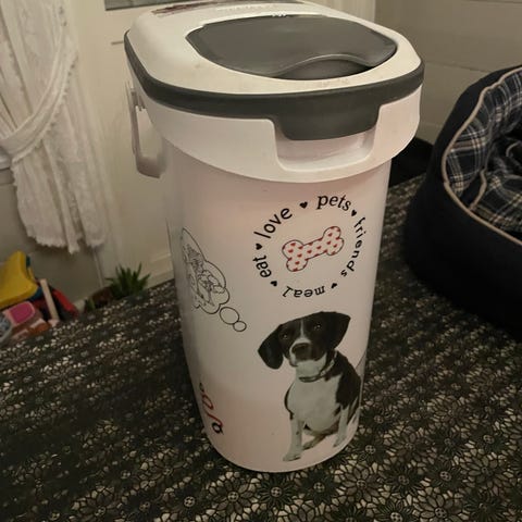 Curver hundefôrbeholder i plast med lokk. Beholderen er hvit med grått lokk og dekor med hundemotiv på sidene. Den har et stort hovedlokk og et mindre lokk på toppen for enkel tilgang til innholdet. Egnet til oppbevaring av tørrfôr eller andre hundeprodukter. Laget i hard plast som er enkel å rengjøre og flytte ved behov. Har to hjul bak