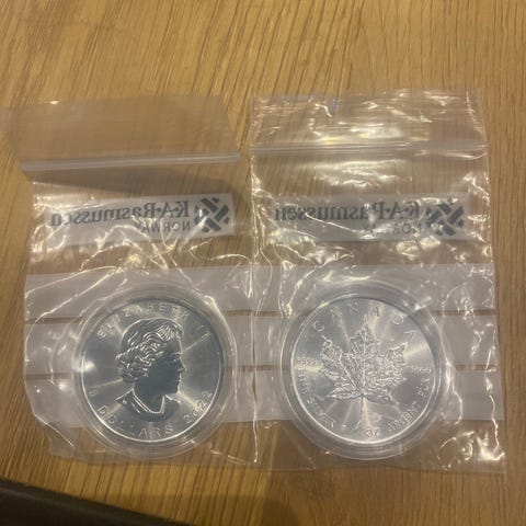 sølvmynter med portrett av dronning på advers. Myntene leveres i plastkapsler, og én mynt ligger i egen plastpose. Egner seg som samlerobjekter eller til oppbevaring for myntsamlere.