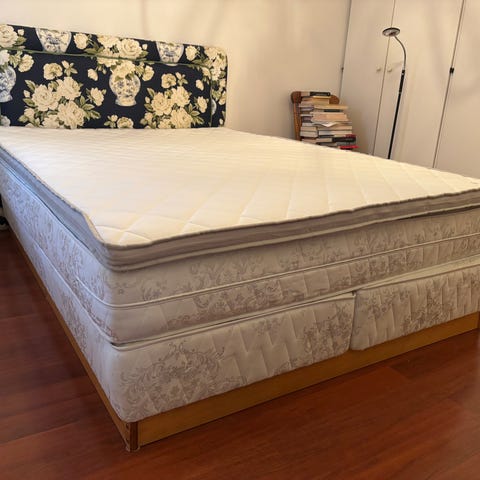 Følger ikke med overmadrass, det bør uansett kjøpes nytt :)