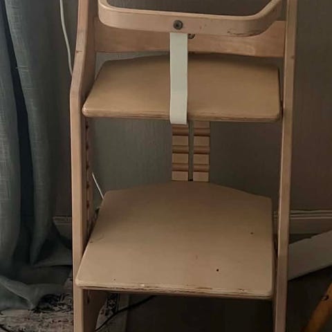 Stokke høy barnestol i tre. Stolen har justerbar sitteplate og fotbrett som kan tilpasses barnets høyde. Egnet som spise- og sitteplass ved bord for barn. Hvit