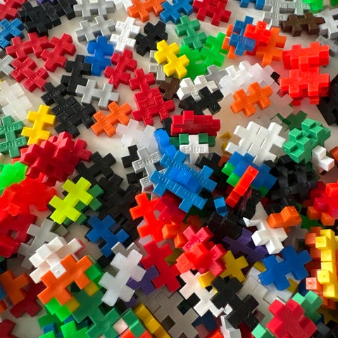 Plus Plus byggedeler i plast i ulike farger. Delene har den karakteristiske Plus Plus-formen og kan brukes til å bygge enkle eller mer avanserte figurer og konstruksjoner. Egnet som konstruksjonsleke for barn som liker å sette sammen og bygge med små plastdeler. Antall deler og eksakt størrelse på delene er ikke spesifisert.