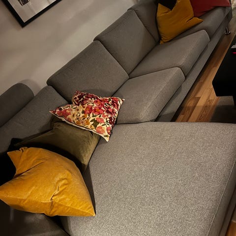 Sofa i god stand selges. Den har noen bruksflekker som trenger grundig rengjøring (se bilder). Den kan deles i to for enkel henting, og putene kan også tas separat. Må hentes fra adressen.