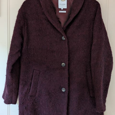 Pen, burgunderfarget vinterjakke med nylonfôr. Stikklommer i sidene. Et hull i foret ved vaskelappen (se bilde). Totallengde 90 cm, lengde undererm 48 cm.