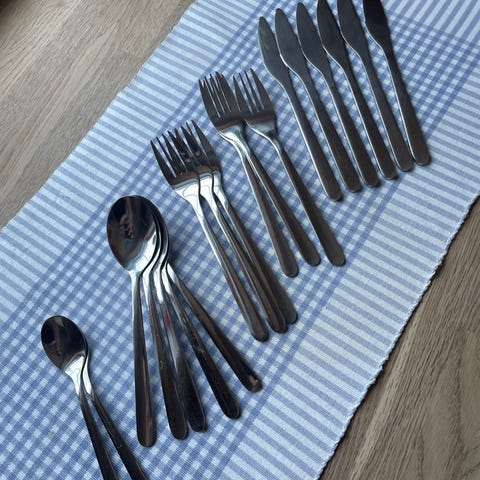 Settet består av kniver, gafler, spiseskjeer og teskjeer i enkelt, klassisk design. Passer til daglig bruk på kjøkken og spisestue. Materialet er rustfritt stål som er lett å rengjøre og egnet til bruk sammen med de fleste typer servise.