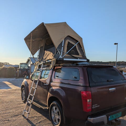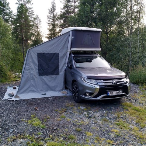 Bilmarkise med telt som man monterer under markisa. Teltet har eget tak og gulv samt myggnett på alle sider. Følger med noen montasjer jeg laget selv.
