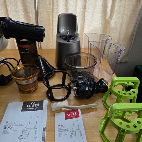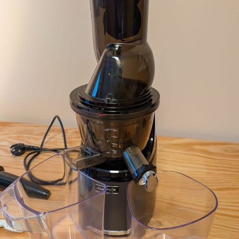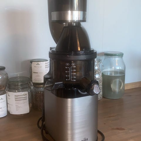 Witt by Kuvings slow juicemaskin. Lite brukt. Funger bra. En god måte å få mest mulig næringsstoffer i juicen. Bedre enn vanlig sentrifuger juicer. Liten bit av plastbeholder holderen sprukket av i toppen men uten betydning for funksjonen. Selges rimelig.