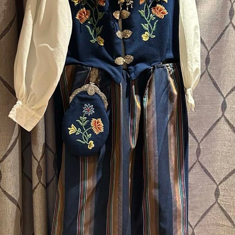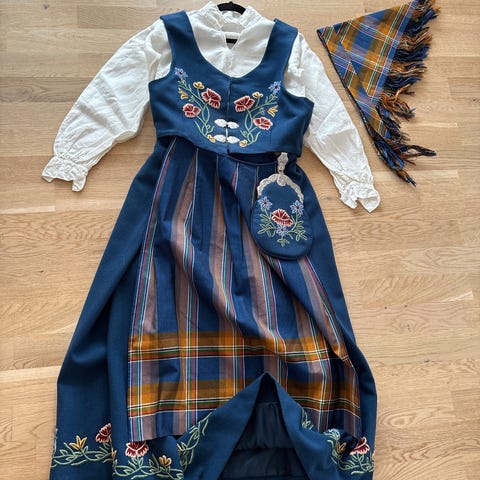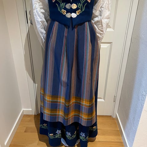 Pent brukt Nordlandsbunad selges. Dette er en eldre utgave av bunaden, og har derfor en lysere og sterkere blåfarge enn dagens modeller – en klassisk og flott variant.