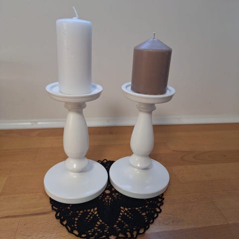 IKEA ERSATTA lysestaker i hvit farge. Klassiske lysestaker med rund fot og rund topp til kubbelys. Selges som et sett med to like lysestaker, egnet til bruk på bord, hylle eller vinduskarm. Materiale ser ut til å være malt tre eller tilsvarende materiale basert på bildene.