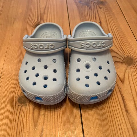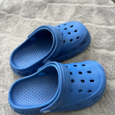 Crocs-lignende barnesko i størrelse 25 for unisex. Skoene er i blå farge med hælrem som kan vippes bak for bedre støtte. Overdelen har hull for ventilasjon og drenering. Sålen har mønster for bedre grep på underlaget. Egnet som hverdagssko, innesko eller til bruk ved vann og strand.