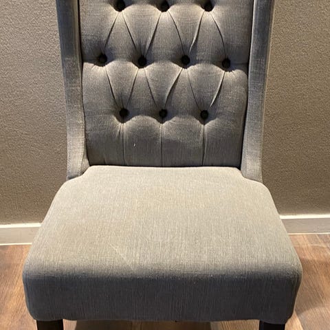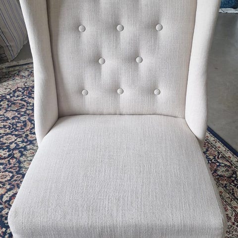 Selger to Riviera Maison kjøkken/ spisestue stoler. Godt brukt men fortsatt pene. En flekk på hvert sete som sikkert kan renses hjemme med møblelrens.. Lys beige med sølvhank bak. Myke og gode å sitte i. Selges samlet til 1100-