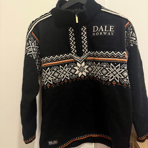 Dale of Norway genser for dame i størrelse S. Genseren er laget i ull og har svart bunnfarge med tradisjonelt mønster. Perfekt på vinteren!