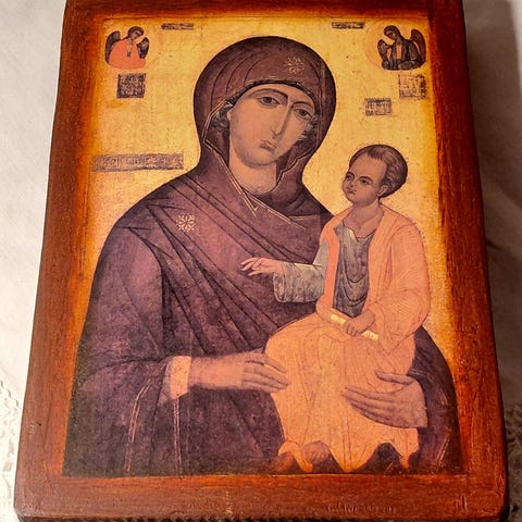 Ikon med motiv av Madonna med barn på treplate. Forsiden viser et tradisjonelt religiøst motiv i varme fargetoner, mens baksiden er ensfarget og slitt. Platen er rektangulær og relativt tynn, egnet til å henge på vegg eller ha stående som dekorasjon. Egner seg som kirkelig/religiøs dekor eller som samlerobjekt for ikoner.