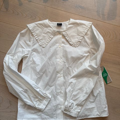 Selger denne blusen fra Gina Tricot i str. 36. Den har åpen rygg, hjerteformet halsutringnig og ballermer. Kun brukt én gang, fremstår helt ny.