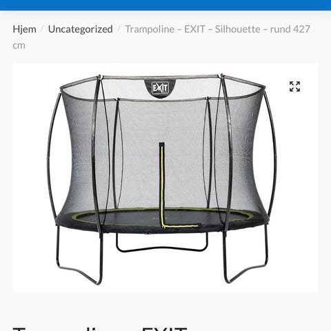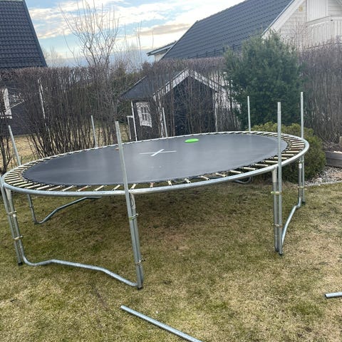 Rund trampoline med sikkerhetsstolper for montering av nett. Trampolinen står utendørs og er egnet for bruk i hage eller på gårdsplass. Størrelse, merke og øvrige spesifikasjoner er ikke oppgitt av selger.