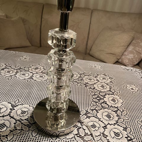 IKEA Asmussen bordlampe med sylinderformet skjerm og bymotiv. Lampen har metallfot og stamme, samt en skjerm i metall/farget glass eller plast med trykk av bysilhuett. Egnet som bordlampe til stue, soverom eller arbeidsplass. Bruker standard lyspære med sokkel som passer til denne lampemodellen fra IKEA.