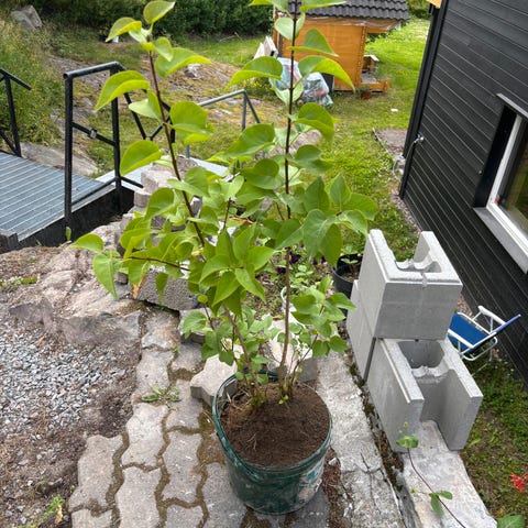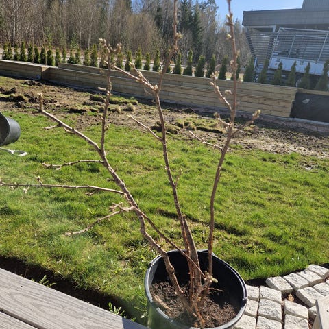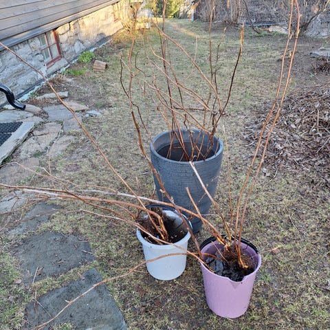 Blomsterpotte med plante i jord. Potter er plassert utendørs og egner seg til bruk på terrasse, balkong eller i hage. Planten fremstår som en mindre busk eller kvistplante uten synlige blader på bildet. Egnet for videre stell og eventuell omplanting etter behov.