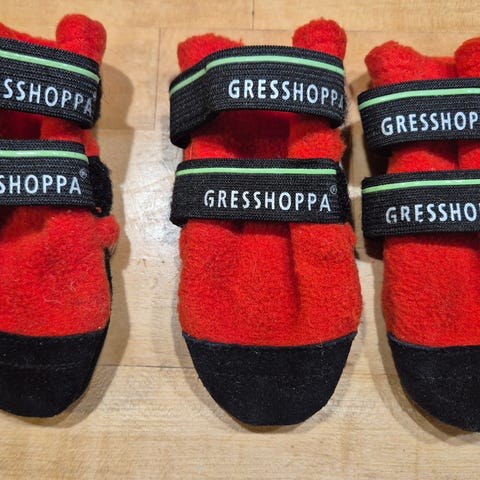 Gresshoppa potesokk med dobbel borrelås til feste. Forsterket med skinn også over tærne for at neglene ikke skal gå gjennom sokken.