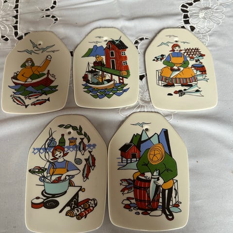 Porselensdeler i serien Torskefiske Figgjo Flint. Fire små platter, en tekopp, et frokostfat med kopp, et serveringsfat, en salt- og en pepperbøsse og to middagstallerkener.