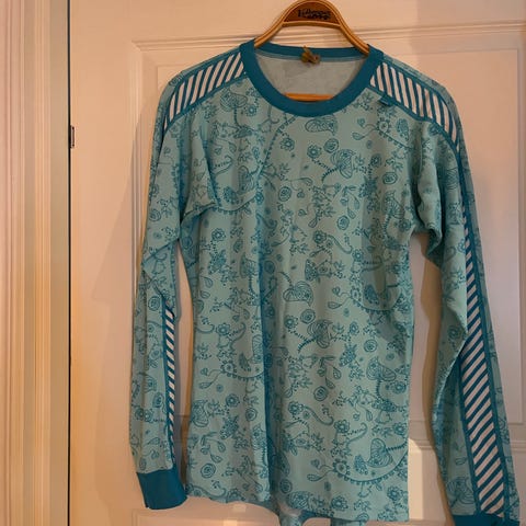 Helly Hansen treningsgenser for dame i størrelse L. Genseren har halv glidelås i front og er laget i et lett, pustende mesh-materiale egnet for ulike typer trening og aktivitet. Flerfarget design med felter i mørk blå, lys blå og offwhite samt kontrastsømmer. Lange ermer med mønsterdetaljer nederst. Passer som mellomlag eller lett overdel ved sport og fritid.