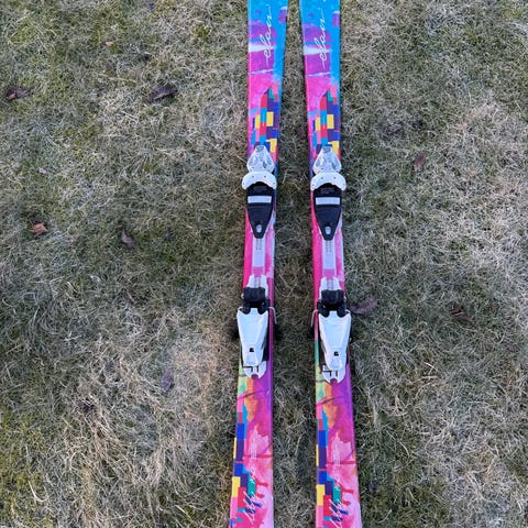 Skiene har et flerfarget design på oversiden og svart såle. Bindingene er montert på skinne, noe som gjør dem justerbare i lengderetningen for å tilpasses ulike støvellengder. Egner seg til vanlig alpint bruk i preparerte løyper.