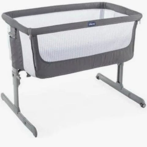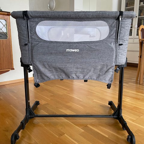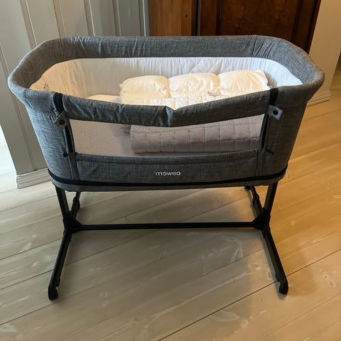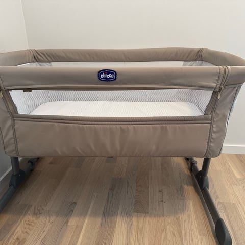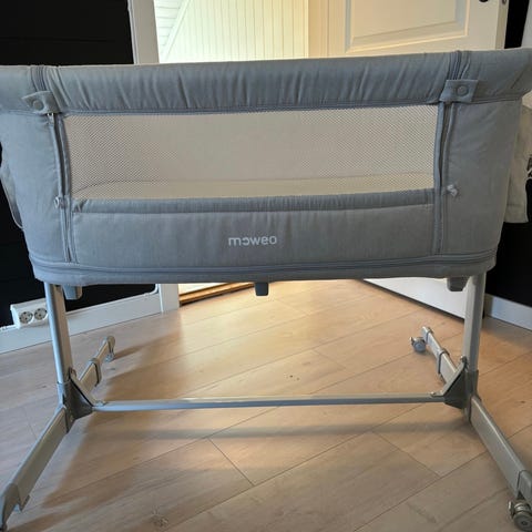 Tavolo bedside crib babyseng i grå tekstil med nettingfelt på sidene. Sengen er beregnet som en liten babyseng som kan stå inntil foreldreseng. Den har justerbart stativ med ben i trelook og hjul for enkel flytting. Åpningen på langsiden gjør det mulig å ha nær kontakt med barnet om natten. Passer til spedbarn i den første perioden, avhengig av vekt- og størrelsesanbefalinger fra produsent. Madrass følger med på bildene, øvrig sengetøy og leker følger kun med dersom det er avtalt i annonsen.