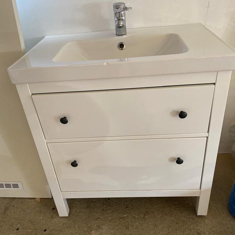 Baderomsinnredning med servant i hvit utførelse, i porselen. Skapet har fire dører med enkle håndtak og gir god oppbevaringsplass under servanten. Overflaten er glatt og enkel å holde ren. Passer til montering på bad der det er behov for kombinert servant og oppbevaringsløsning.
