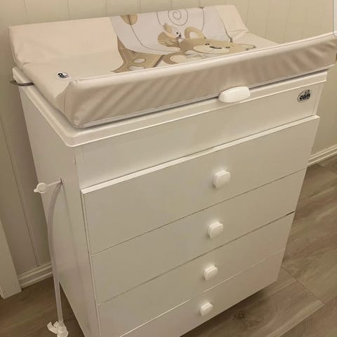Stellekommoden har flere skuffer for oppbevaring av bleier, klær og annet babyutstyr. På toppen er det en polstret stellematte med plasttrekk og motiv i lyse, nøytrale farger. Under stelleflaten er det et innebygd badekar som kan løftes opp ved behov. På siden er det praktiske holdere for såpe, vaskekluter eller annet tilbehør.