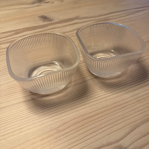 Sett med små boller i klart krystall med buet kant og dekorativt slipt mønster i siden og bunnen. Bollene egner seg til servering av dessert, frukt, snacks eller tilbehør på bordet. Klassisk design som passer sammen med annet klart glasservise.