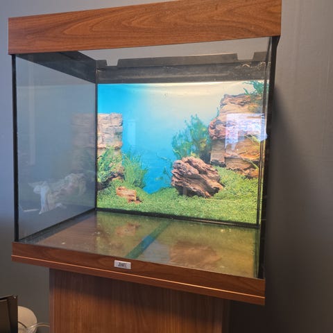 Juwel akvarium med buet front og tilhørende skap i svart utførelse. Akvariet står på et hjørneskap med to dører for oppbevaring av utstyr. Inne i karet er det grus som bunnsubstrat og dekorasjon i form av et skipsvrak. Akvariet har lokk med integrert belysning. Egnet for ferskvannsakvarium, for eksempel med små til mellomstore fiskearter. Skapet gir plass til filter, fôr og annet akvarieutstyr.