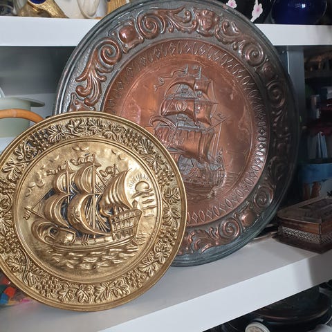 Selger et matchende par antikke tyske veggplater i presset metall, datert til ca. 1895–1905.