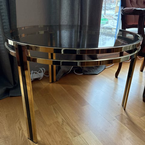 To stk glassbord med gullkant. Passer fint til en sofakrok eller lignende. Diameter på det største bordet er ca 50 cm og det minste 40 cm.