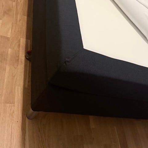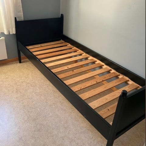 Treskjært seng i 130x2 med madrass og ubrukt overmadrass.