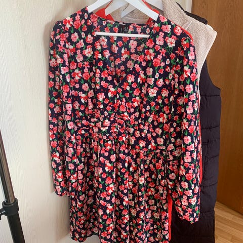 H&M kjole for dame i størrelse XL. Kjolen er laget i viskose og har et flerfarget mønster med hovedsakelig lyse og mørke toner. Lengden er midi med lange ermer. Modellen har høy krage, knappelukking foran og markert midje med knytebelte. Passformen er regular fit, og ermene har ballongeffekt med raglanermer. Stoffet er lett og faller mykt, egnet til både hverdagsbruk og mer pyntede anledninger.