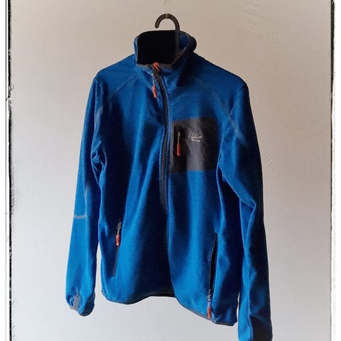 Ull(vadmel?)jakke med strikkede partier på skuldre, rygg og ermer, samt broderier i halsen. Silkefór inni