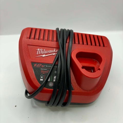 Milwaukee M12-18C batterilader i rød farge. Laderen er beregnet for oppladbare batterier i Milwaukee M12- og M18-serien. Den har nettkabel med støpsel for tilkobling til vanlig stikkontakt. Egnet for lading av kompatible verktøybatterier til bruk i ulike elektroverktøy fra Milwaukee.