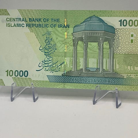 Central Bank of the Islamic Republic of Iran 5000 rials seddel. Forsiden har portrett og dekorative mønstre med pålydende verdi 5000 rials. Baksiden viser en dekorert bolle og en mynt, sammen med tekst og pålydende verdi. Seddelen er trykt i flere farger og egner seg som samleobjekt for numismatikere og andre som samler på utenlandske pengesedler.