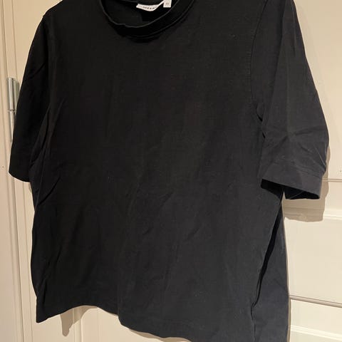 H&M Mama T-skjorte for dame i størrelse S. T-skjorten er svart og laget av bomull. Modellen har kort erm og rund hals. Egner seg som basisplagg i hverdagen og kan brukes alene eller under andre plagg. Materialet er lett og mykt, med vaskeanvisning på innsiden av plagget.