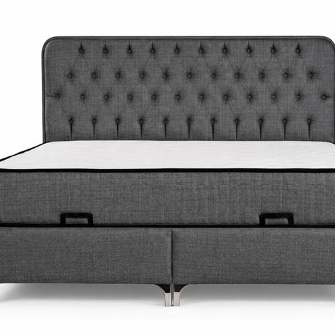 Förvaringssäng i grått textil med huvudgavel. Sängen har en lyftmekanism som ger förvaringsutrymme under liggytan. Huvudgavel och madrass.