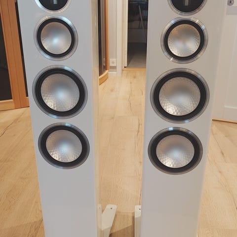 Mine høyttalere består av ett par strøkne Monitor Audio PL300 mk2 i nydelig blank ebony finish. Dem låter helt fantastisk! Du finner mye info om disse på nettet om du søker :)