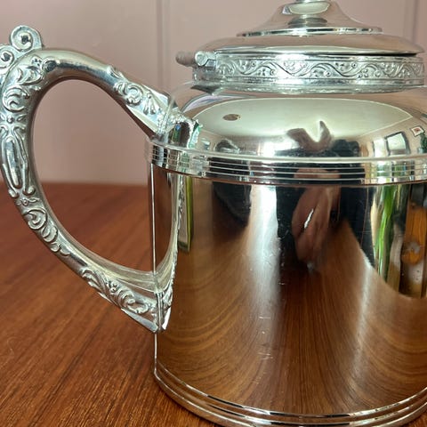 Oneida og HK Pakka 60 Gr. sølvplett tekanne med tilhørende sukkerkopp, fløtemugge og serveringsbrett. Sett i klassisk stil med dekorert kant på brettet og profilerte føtter på delene. Overflaten har patina og bruksspor. Egnet som serveringssett til te eller kaffe, eller som dekorativt innslag på bord eller skjenk. Dessverre ikke pusset da det bare har vært lagret lenge