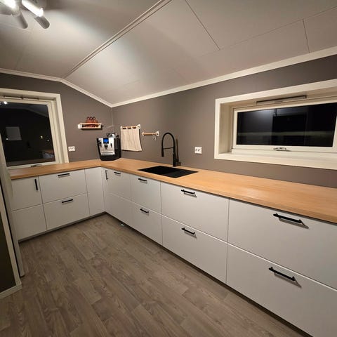 Kjøkkeninnredning i hjørneløsning med hvite, glatte fronter og rette stålhåndtak. Benkeplater i treverk. Egner seg for ombruk i bolig, hytte eller hybel der det er behov for en kompakt kjøkkenløsning. Følger med oppvaskmaskin, mikro og fryser, vifte og vask/blandebatteri. Kjøleskap kan hentes separat etter nytt kjøkken er montert. Benkeplaten har flere hakk og vannmerker, men fungerer helt fint. Ellers fint kjøkken.