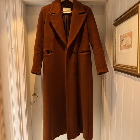 Nydelig kåpe fra Ivy & Oak i 75% ull. Lengde er ned til leggen på meg som er 163 cm. Veldig pen passform.Kamelfarget.